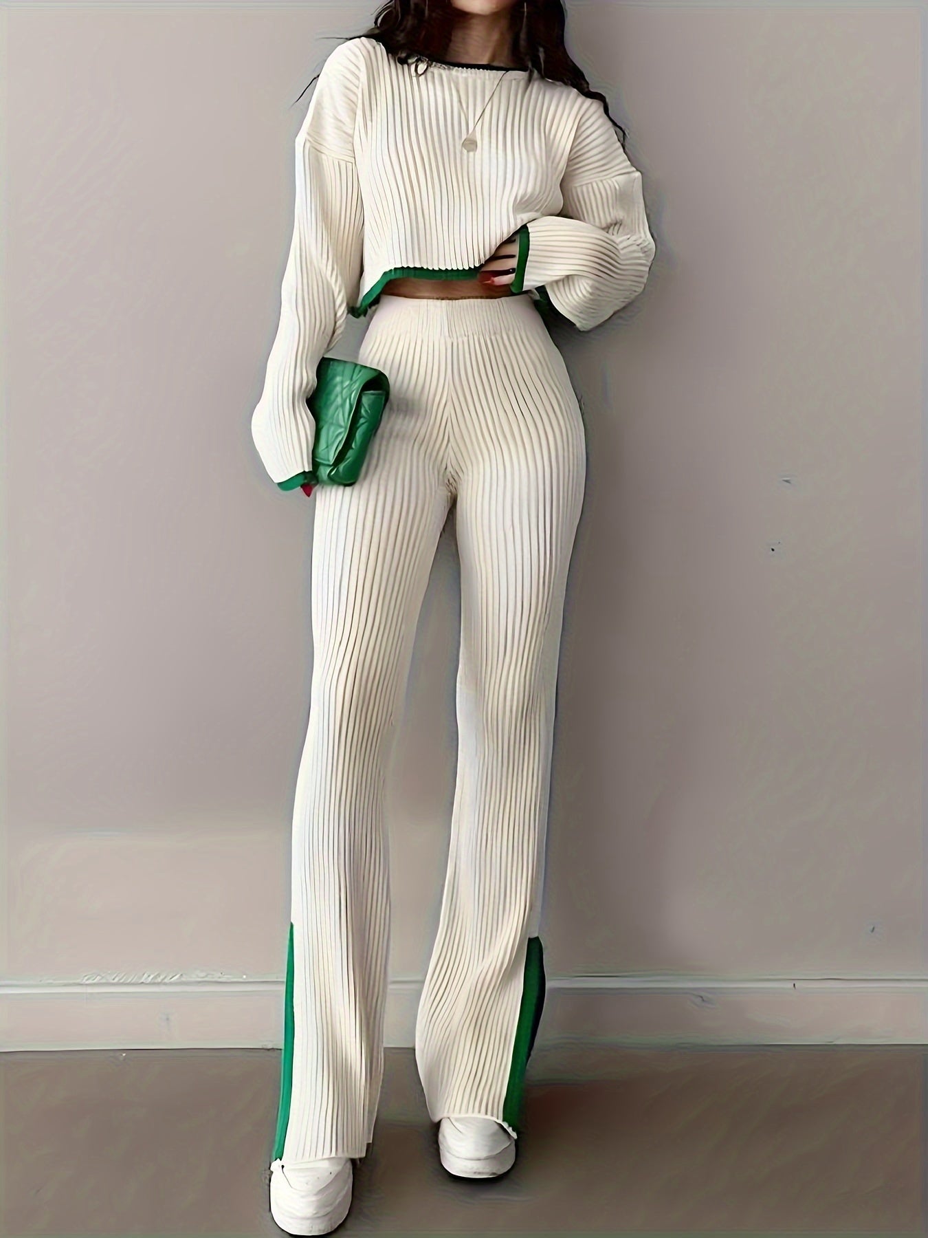 Co-ord Set for Women, Solid Color Polyester Knit Fabric, Drop Shoulder Long Sleeve Crop Top & High Waist Fitted Trousers